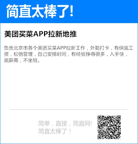 负责北京市各个美团买菜APP拉新工作,外勤打卡,有保底工资,松弛管理,自己安排时间,有经验挣得很多,入手快,底薪高,不坐班。