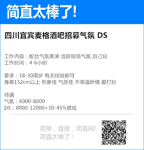 四川宜宾麦格酒吧招募气氛 DS(若干人)