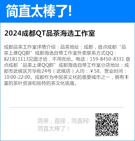 成都品茶工作室详情介绍:品茶地址:成都,盘点成都“品茶上课QQ群”成都海选自带工作室外卖联系方式QQ : 821811113见面才给,不用先给。电话:159-8450-8331 盘点成都“品茶上课QQ群”成都海选自带工作室分店地址:成都市武侯区芳华街24号(武侯店)人均:¥58、营业时间:10:00-22:00。成都作为中国茶文化的重要城市之一,拥有丰富的茶叶资源和独特的茶文化底蕴。