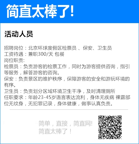 招聘岗位:服务员/洗碗工 招聘人数:25(国庆每天要人) 年龄性别:不限 工作时间:4-10小时一个自选 工作内容:上菜、收桌等简单工作 工作地点:北京朝阳区四季民福烤鸭店(其他分店也招) ...