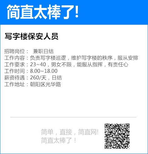 工作内容:负责写字楼巡逻,维护写字楼的秩序,服从安排