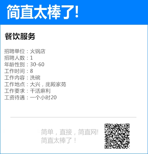招聘岗位:服务员/洗碗工 招聘人数:25(国庆每天要人) 年龄性别:不限 工作时间:4-10小时一个自选 工作内容:上菜、收桌等简单工作 工作地点:北京朝阳区四季民福烤鸭店(其他分店也招) ...