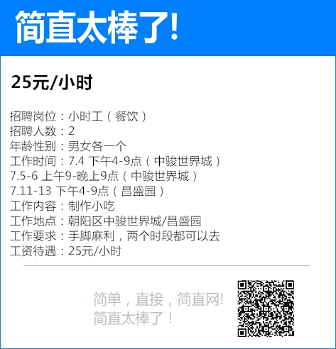 招聘岗位:服务员/洗碗工 招聘人数:25(国庆每天要人) 年龄性别:不限 工作时间:4-10小时一个自选 工作内容:上菜、收桌等简单工作 工作地点:北京朝阳区四季民福烤鸭店(其他分店也招) ...