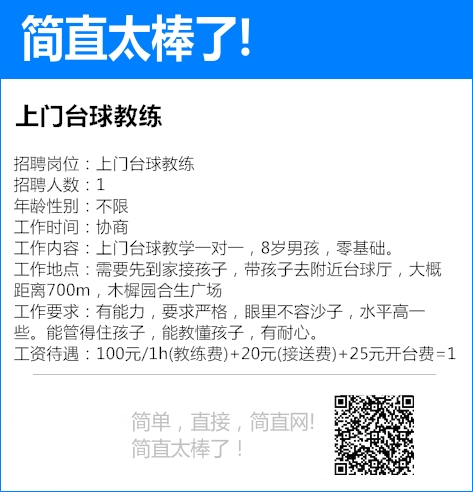 工作内容:上门台球教学一对一,8岁男孩,零基础。