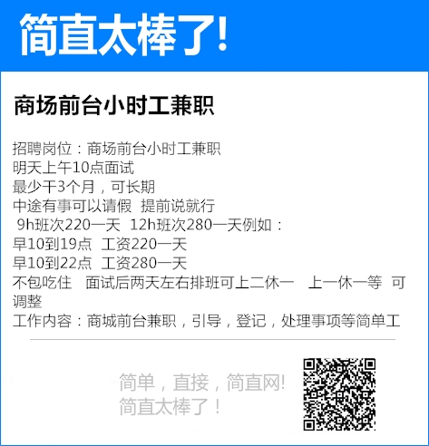 招聘岗位:站岗执勤 招聘人数:8 年龄性别:18-45 工作时间:8 月 9 日-13 日,两班倒 工作内容:站岗巡逻 工作地点:西城白纸坊 工作要求:无犯罪,退伍军人优先 工资待遇:每...