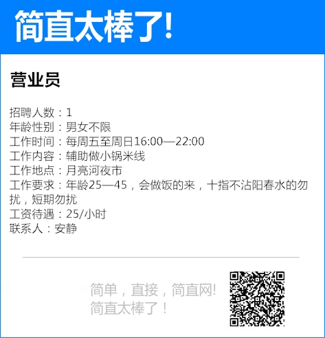 招聘岗位:兼职店员 招聘人数:4 年龄性别:不限 工作时间:具体谈 工作内容:店员 工作地点:海淀圣熙八号,前门北京坊 工作要求:春节期间 工资待遇:具体沟通 联系人:刘女士