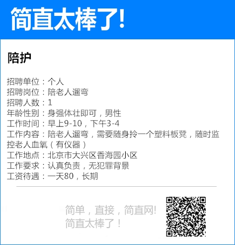 招聘岗位:站岗执勤 招聘人数:8 年龄性别:18-45 工作时间:8 月 9 日-13 日,两班倒 工作内容:站岗巡逻 工作地点:西城白纸坊 工作要求:无犯罪,退伍军人优先 工资待遇:每...
