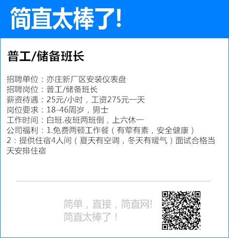 日结20一小时,220-240一天 ,长白班 普工,长白班 不体检,活超级轻松辅助机器操作 年龄:18-40,男女不限 厂区福利食堂 管住宿 福利:国内传统假日发放各种大礼包,过年有大红包、小...