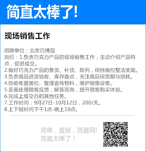 招聘人数:2 年龄性别:女 20-30 工作时间:3月7号到10号 8:50到18:00 工作内容:珠宝销售 工作地点:西城区北京展览馆 工作要求:形象佳,爱说话,有销售经验者优先 ...