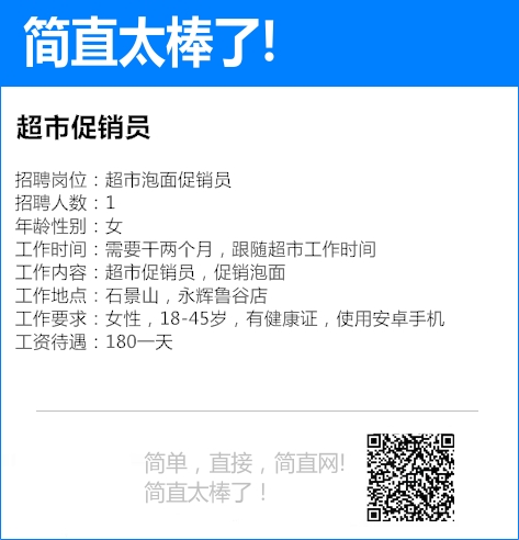 招聘单位:首钢园(北京市石景山区石景山路68号) 招聘岗位:诚聘女促销员4-5人 工作日期:9月10-14(5天连续) 工作时间:8.30-17.30 工作内容:食品.日用品 促销 人员要求...