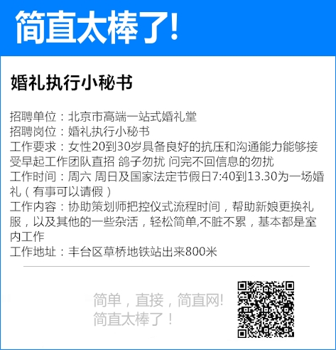 招聘岗位:站岗执勤 招聘人数:8 年龄性别:18-45 工作时间:8 月 9 日-13 日,两班倒 工作内容:站岗巡逻 工作地点:西城白纸坊 工作要求:无犯罪,退伍军人优先 工资待遇:每...
