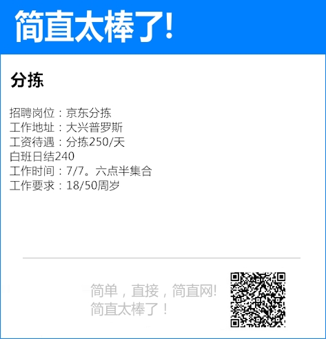 招聘岗位:上架,排序,扫码 招聘人数:三人 年龄性别:男,20到35岁 工作时间:早上八点半到晚上六点 工作内容:上架,把书放架子上,扫码,排序 工作地点:北京昌平 工作要求:身体健康,服...