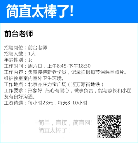 招聘岗位:晚自习看管老师 招聘人数:2人 年龄性别:女 工作时间:18:30—21:30 工作内容:小初学生作业答疑 工作地点:通州爱琴海附近 工作要求:认真负责,大学毕业,数学物理好 ...