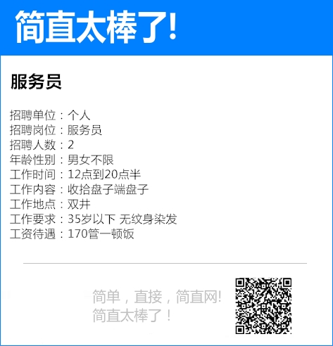 招聘岗位:服务员/洗碗工 招聘人数:25(国庆每天要人) 年龄性别:不限 工作时间:4-10小时一个自选 工作内容:上菜、收桌等简单工作 工作地点:北京朝阳区四季民福烤鸭店(其他分店也招) ...